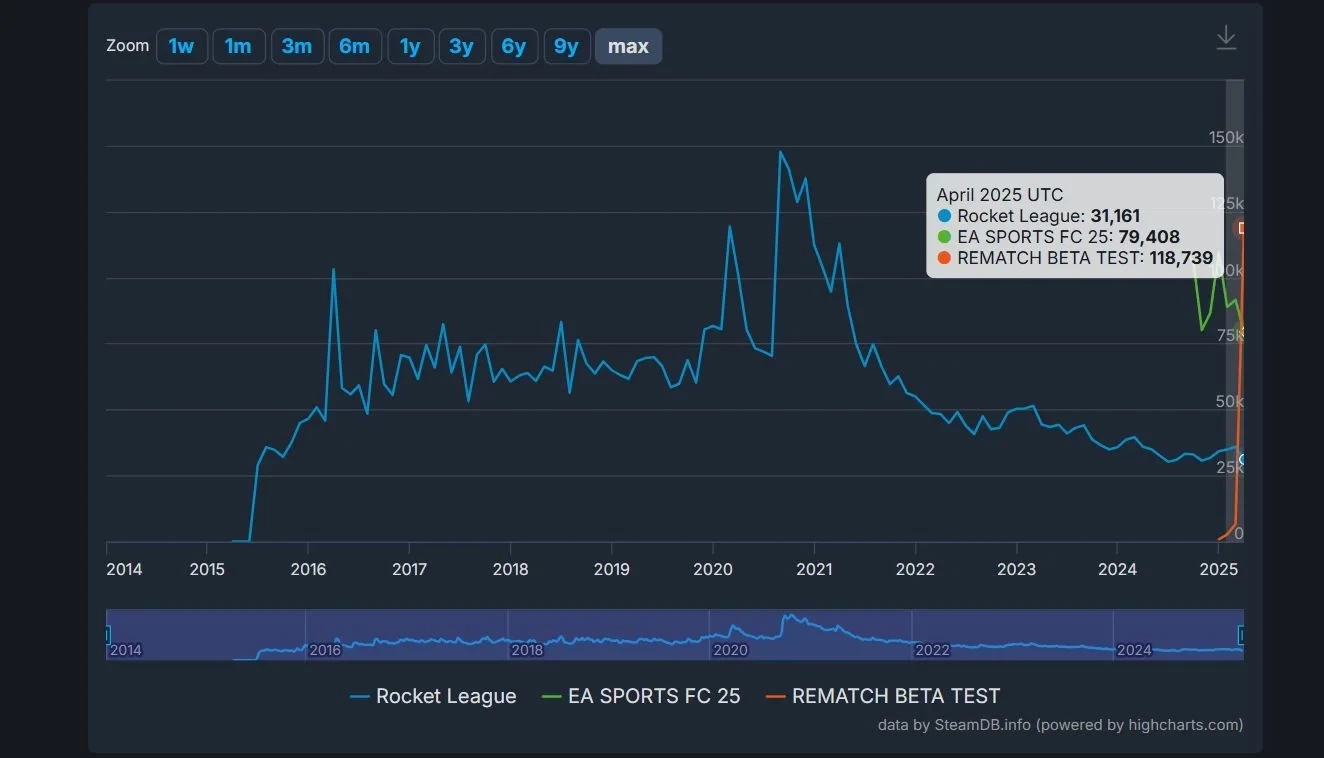 Можно отметить, что это число превосходит максимальную посещаемость, которую продемонстрировал в Steam симулятор EA Sports FC 25. Интерес к Rematch можно сравнить с успехами Rocket League в сходный период жизни игры.