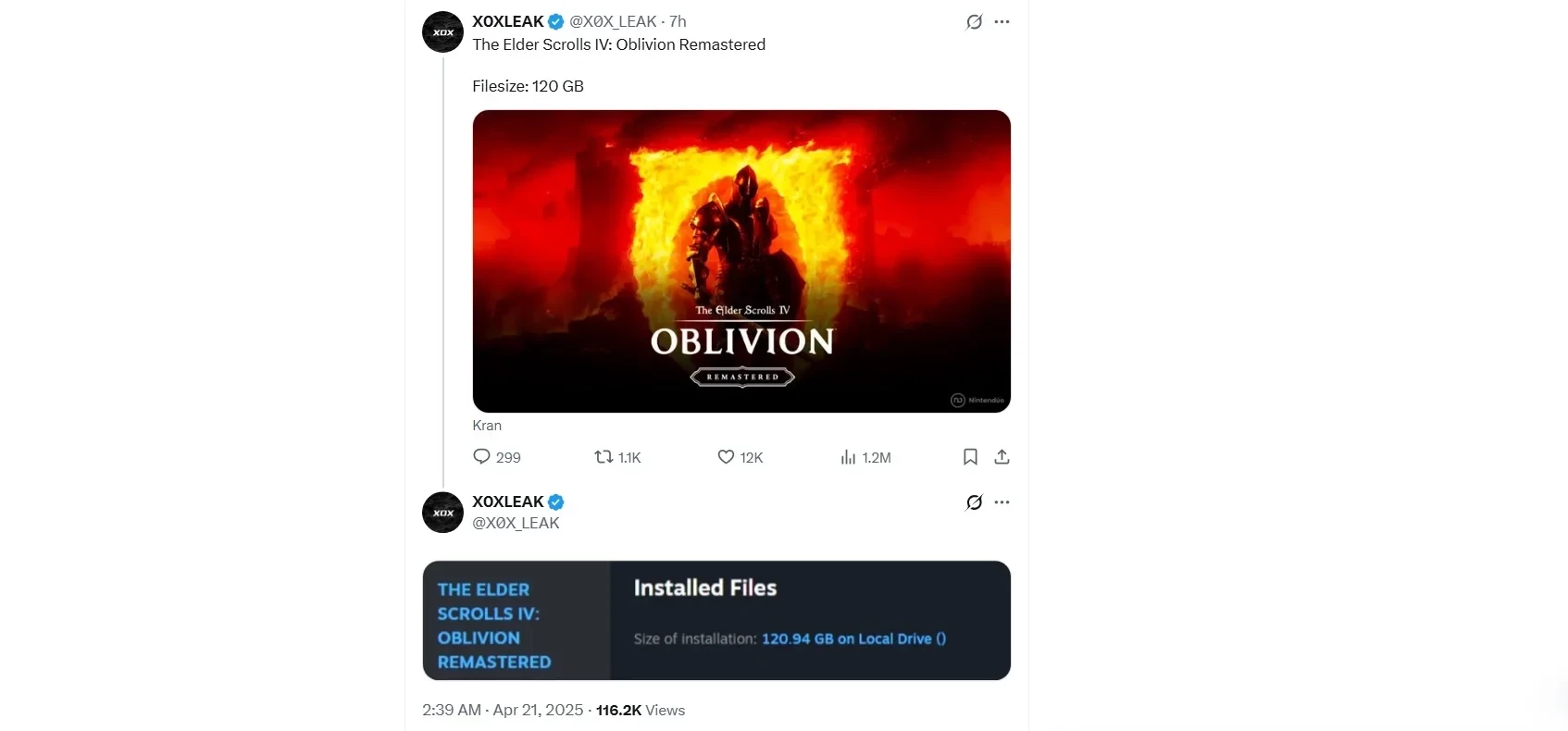 Так, датамайнеры из команды X0XLEAK узнали предполагаемый размер файла игры в Steam — 120,94 ГБ. Для сравнения: GOTY-издание оригинальной Oblivion «весит» всего 4,6 ГБ.