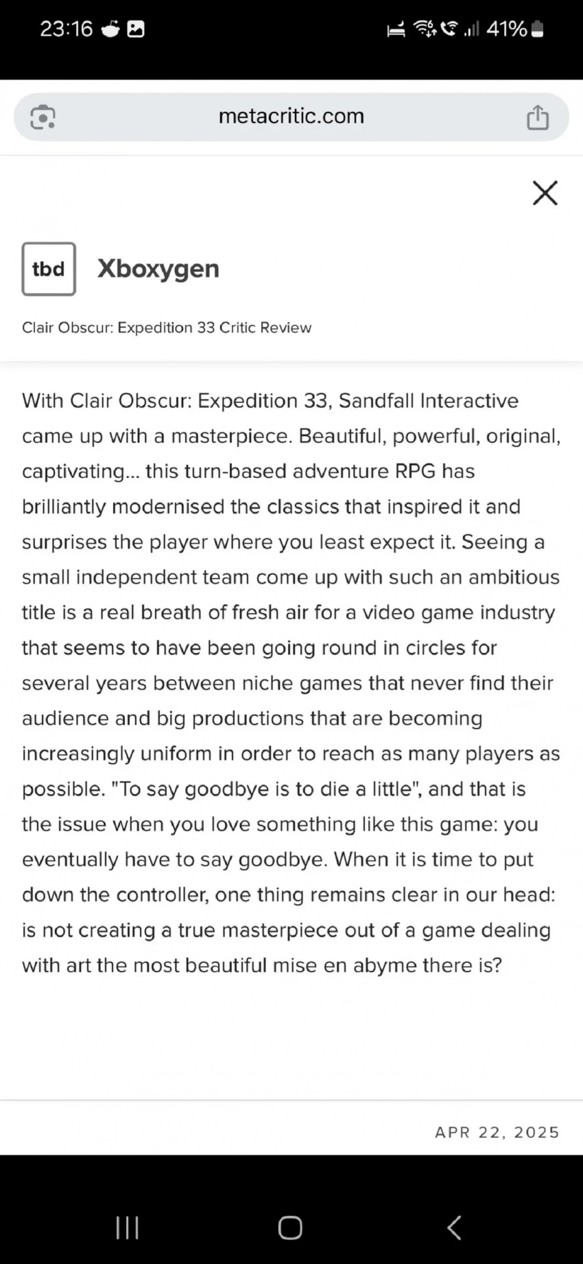 Находку ожидаемо успели заскриншотить и изучить. Согласно ей, Clair Obscur: Expedition 33 вышла настоящим «шедевром» — «прекрасным, мощным, оригинальным и захватывающим». Разработчики удачно осовременили классику жанра пошаговых RPG и удивляют там, где «меньше всего этого ожидаешь».