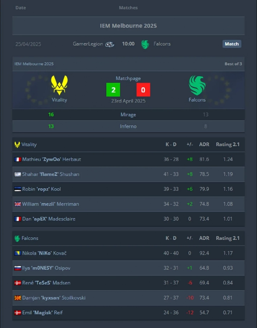 Матч Vitality и Falcons проходил в формате BO3. Falcons проиграла две карты — Mirage со счётом 13:16 и Inferno со счётом 8:13. Этот успех позволил Vitality пройти в полуфинал — матч пройдёт 26 апреля в 13:00 по МСК.