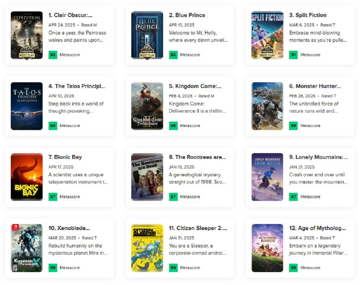 Ближайший конкурент по баллам — кооперативное приключение Split Fiction, которое заслужило 91 балл. Переиздание культовой головоломки The Talos Principle находится на четвёртом месте с 90 баллами, а ролевая игра Kingdom Come: Deliverance 2 занимает пятую строчку — она получила 88 баллов на основе отзывов критиков.