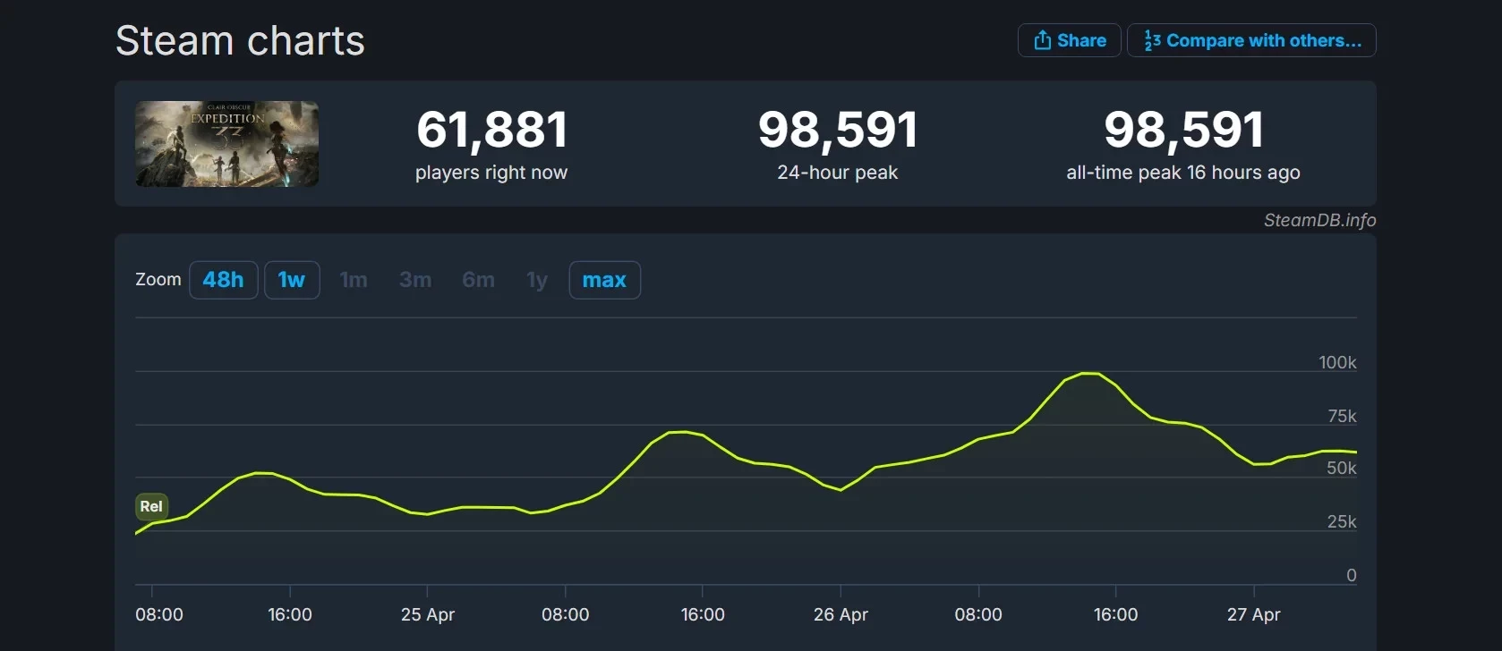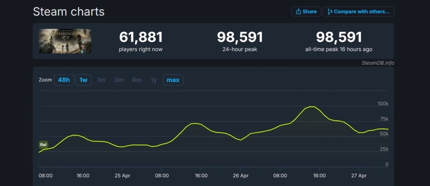 Главная » Статьи » Пик онлайна Clair Obscur: Expedition 33 в Steam почти достиг отметки в 100 тысяч игроков