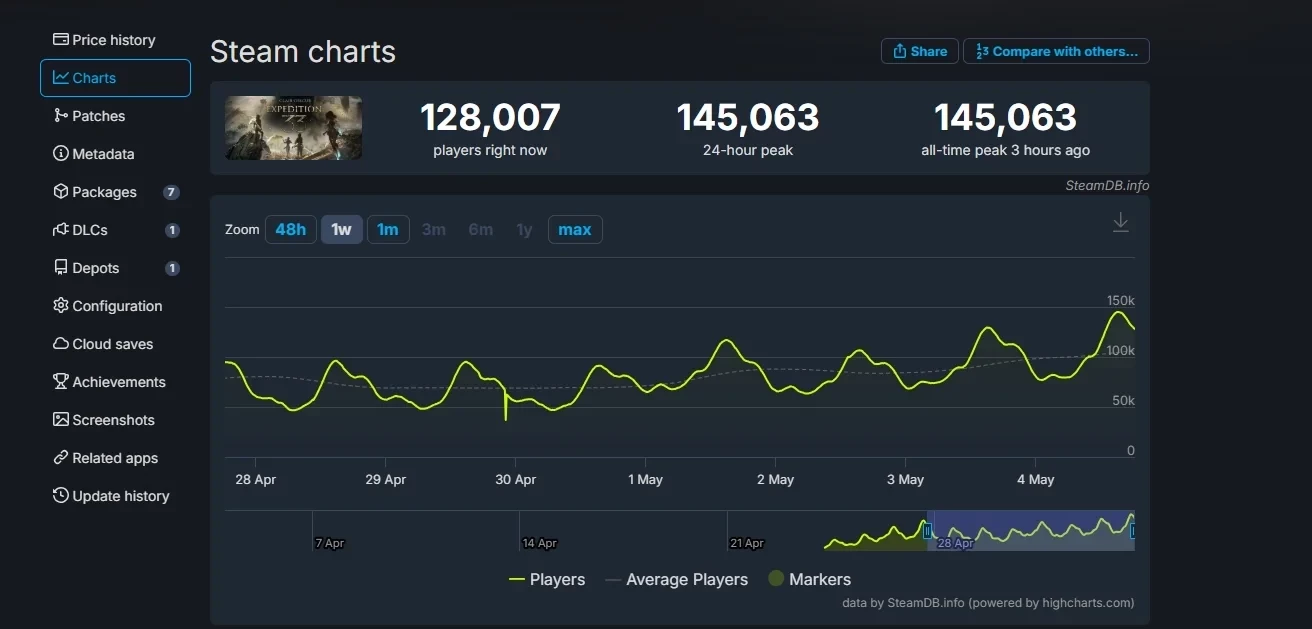 Для сравнения, вчера, 3 мая, в Expedition 33 в Steam одновременно находились чуть менее 130 тыс человек. А вскоре после релиза, к 27 апреля, этот показатель превышал 120 тыс.