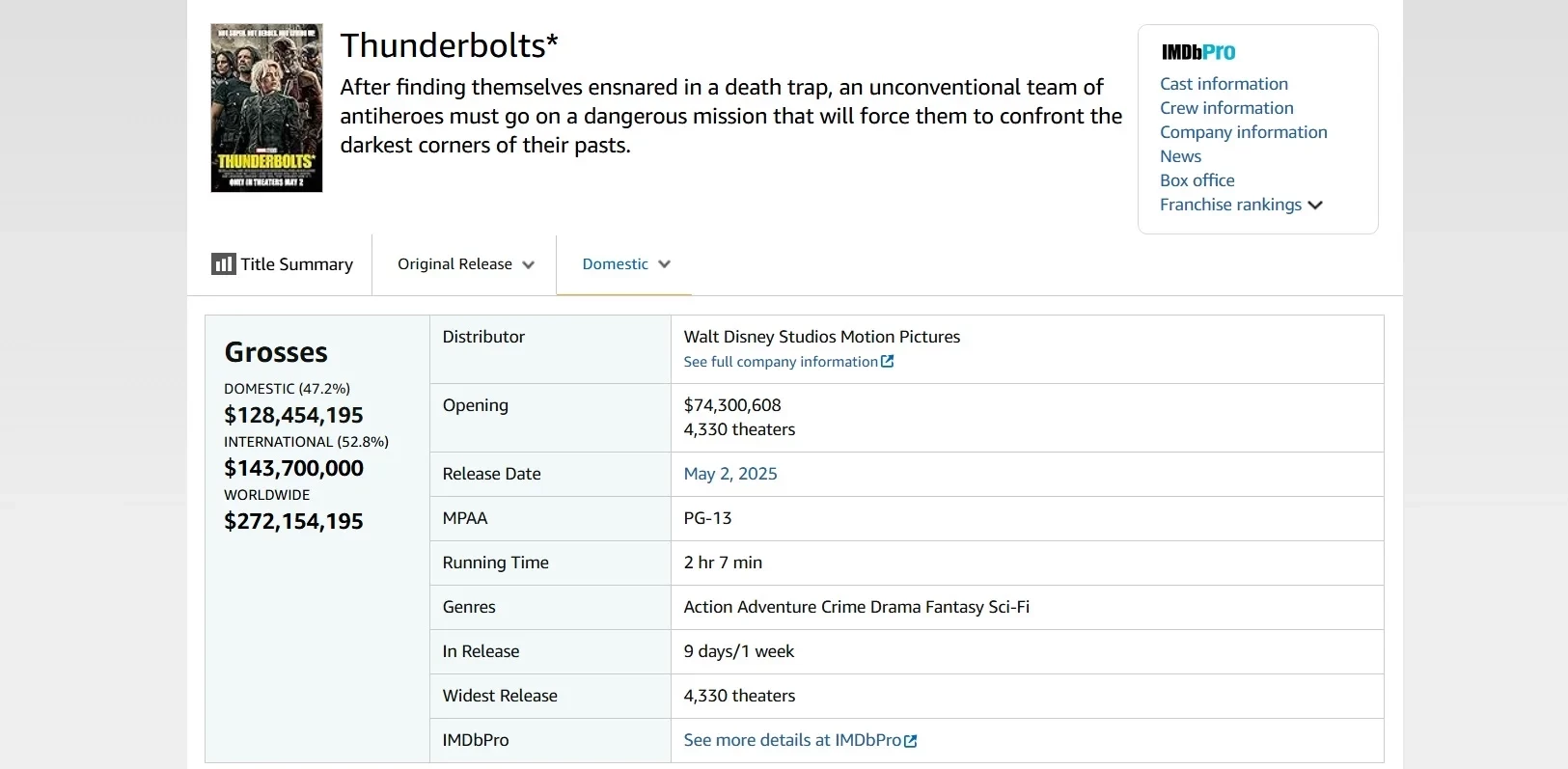 Самое интересное о кино на YouTube канале Игромании!Обложка: кадр фильма «Громовержцы*»Супергеройский боевик MCU «Громовержцы*» по итогам второго уикенда в прокате США собрал ещё 33,1 млн долларов. Общая касса фильма достигла 272,1 млн долларов: