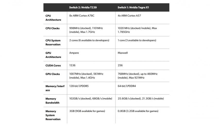 И чтобы показать, насколько новая консоль Nintendo превосходит старую, журналисты поделились таблицей, сравнивающей обе модели Switch. Можно заметить, что новая консоль заметно (порой даже в разы) превосходит старую: это касается и процессора, и видеокарты, и памяти устройства.