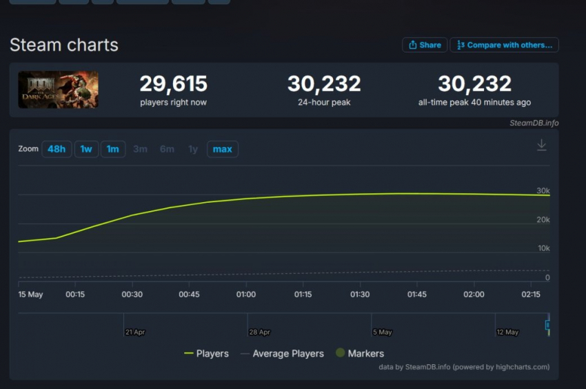 На момент написания новости пиковый онлайн DOOM: The Dark Ages в Steam составил 30 232 игроков одновременно. Это третий лучший результат в рамках серии: