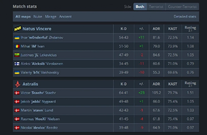 Личная статистика игроков по всем трём картам в матче Na’Vi против Astralis