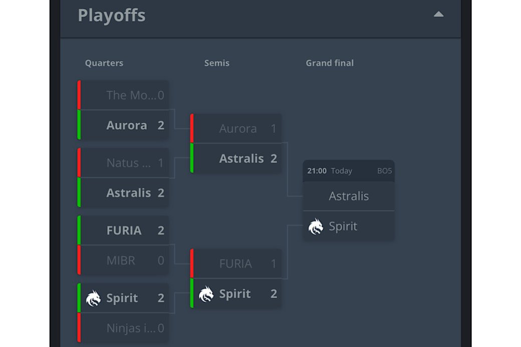 Отметим, что для Spirit это первый финал с февраля, когда команда заняла второе место на IEM Katowice. Astralis, победившая Aurora в полуфинале (2:1), вышла в финал топ-турнира впервые с января 2021 года.
