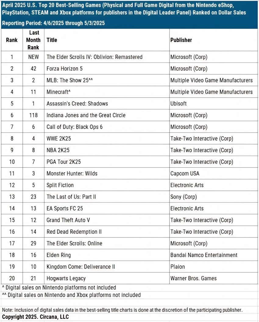 Ещё больше интересных видео на YouTube канале Игромании!Обложка: The Elder Scrolls IV: Oblivion RemasteredАналитик Мэт Пискателла из Circana рассказал о самых продаваемых видеоиграх в США в апреле 2025 года. Учитывались доходы с продаж игр как в рознице, так и в цифре.