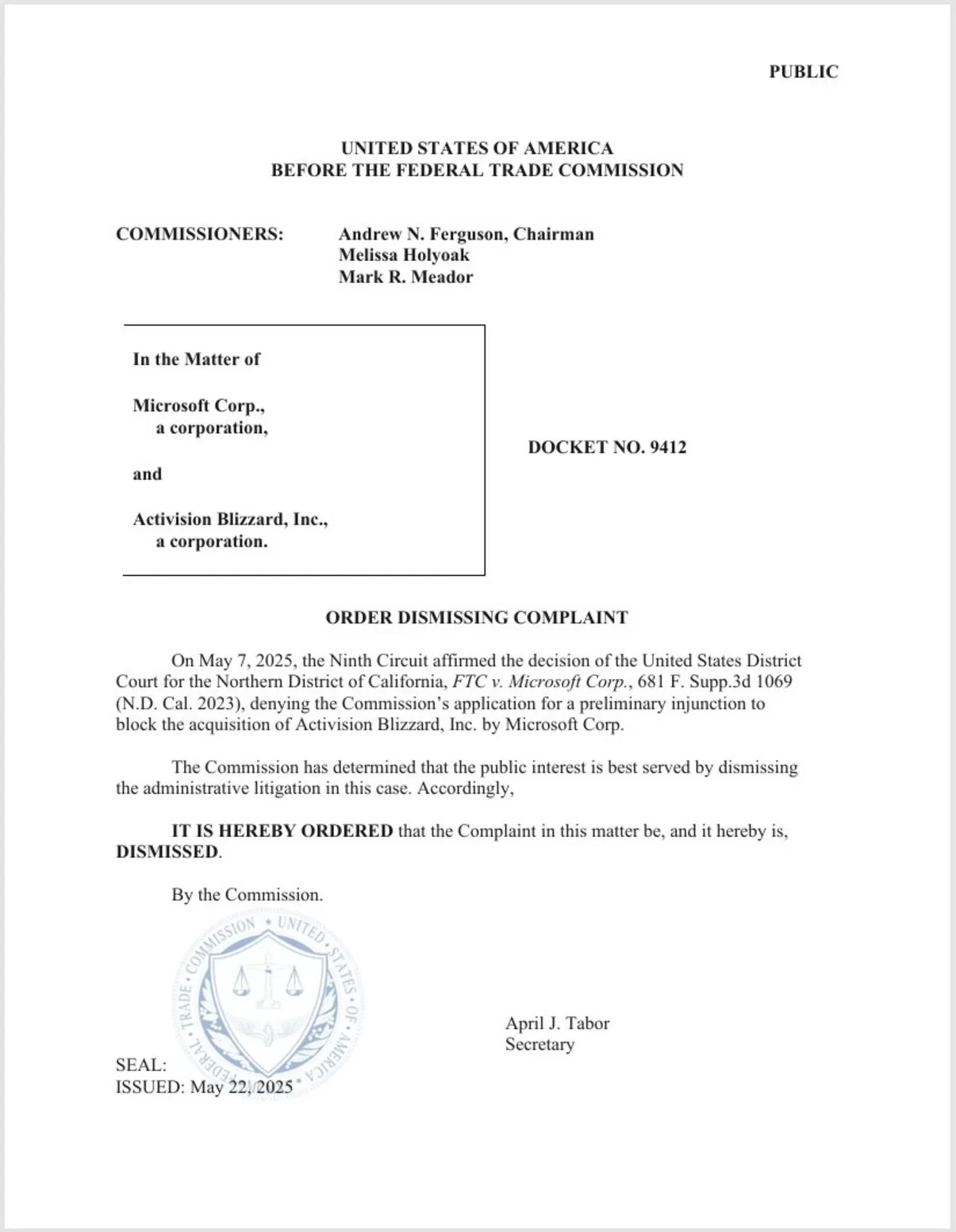 Ещё больше интересных видео на YouTube канале Игромании!Обложка: логотипы Microsoft и Activision BlizzardФедеральная торговая комиссия США (FTC) официально прекратила судебное разбирательство против сделки Microsoft по приобретению Activision Blizzard. Соответствующее постановление о прекращении иска было подано в четверг, 22 мая — спустя несколько дней после того, как апелляционный суд отклонил просьбу ФТК о предварительном запрете на завершение сделки.