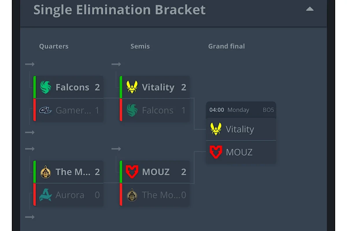 Team Vitality одержала победу над Team Falcons со счетом 2:1 (13:7 на Dust2, 6:13 на Train, 13:11 на Inferno). В решающем матче команда сразится с MOUZ, которая ранее уверенно сразила The Mongolz со счетом 2:0 (13:11 на Inferno и 13:11 на Nuke).