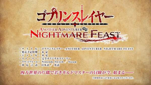 Компания The Goblin Slayer 2 Production Committee анонсировала видеоигру по мотивам одноименного ранобэ. Объявлено, что тайтл под названием Goblin Slayer Another Adventurer: Nightmare Feast расскажет какую-то совершенно новую историю и выйдет как на PC, так и на Nintendo Switch сразу на японском и английском языках.
