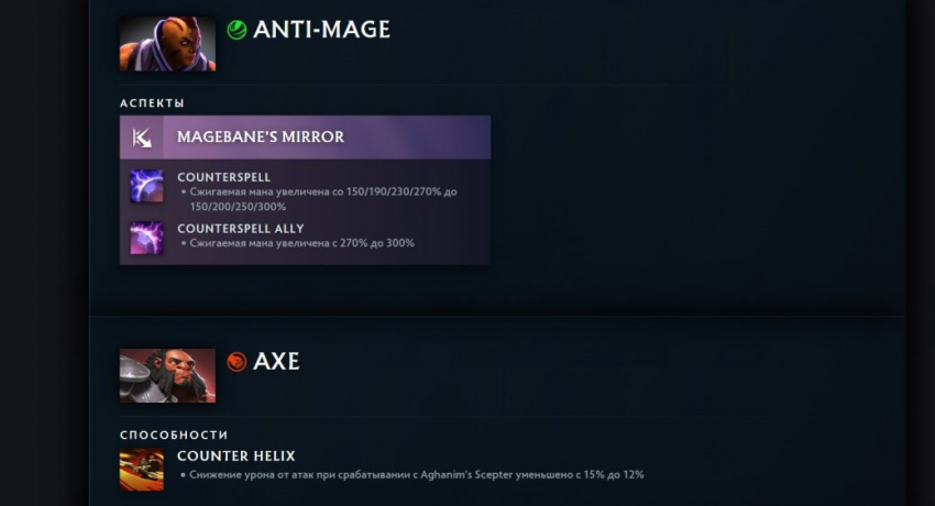 • Anti-Mage: аспекты Magebaneʼs Mirror, Counterspell — сжигаемая мана увеличена со 150/190/230/270% до 150/200/250/300%; Counterspell Ally — cжигаемая мана увеличена с 270% до 300%;