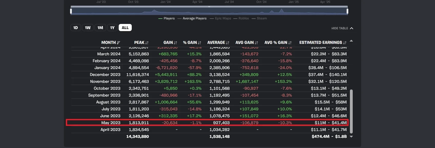 По данным Fortnite.gg, аудитория Fortnite достигла самого низкого числа игроков за последние два года. В мае 2025 года средний онлайн составил 1, 039 млн игроков.