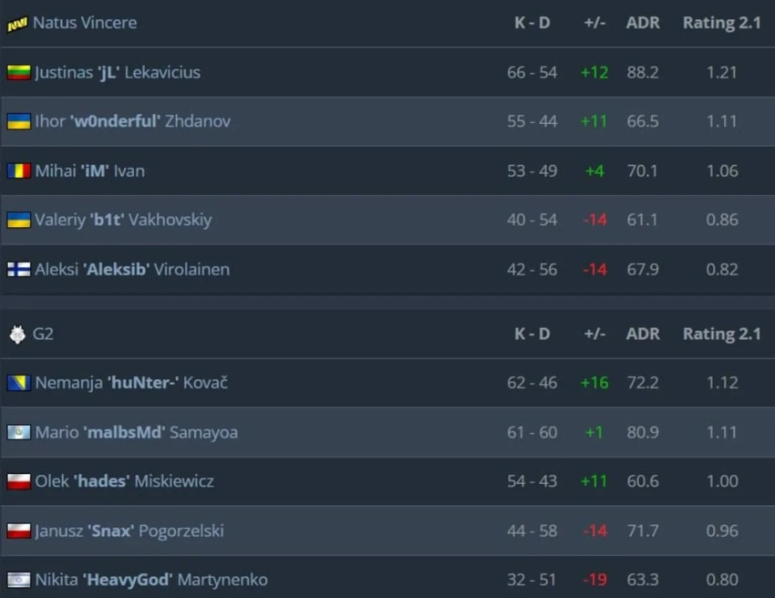 Матч против G2 оказался непростой задачей. На карте Mirage Natus Vincere с трудом добилась преимущества, благодаря индивидуальным усилиям Юстинаса «⁠jL⁠» Лекавичюса и Михая «⁠iM⁠» Ивана. Хотя команда увеличила своё лидерство, выиграв пистолетный раунд, G2 почти вернулась в игру, но всё же уступила со счётом 13:10.