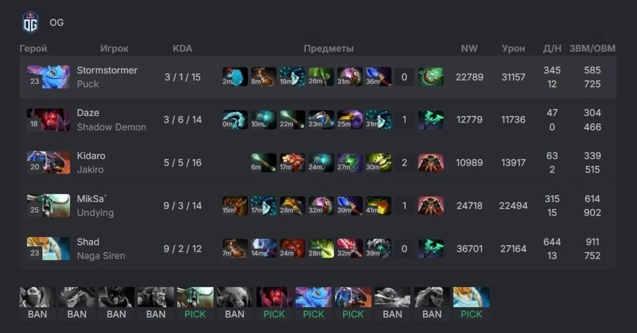 Команда OG теперь продолжит борьбу в нижней сетке квалификации, где встретится с победителем пары Nigma Galaxy — Yellow Submarine за второй слот на The International.