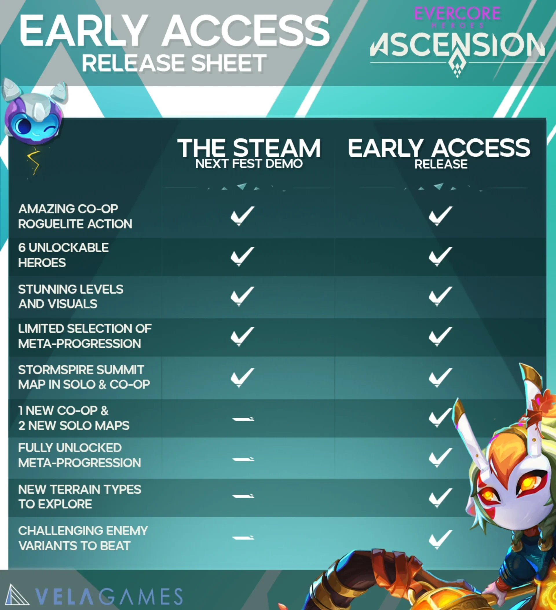 Новых героев пока нет, однако, они появятся в будущих патчах. Весь прогресс из демки сохраняется и переносится в версию игры раннего доступа. В этот раз Evercore перевели на большее количество языков, в том числе на русский.