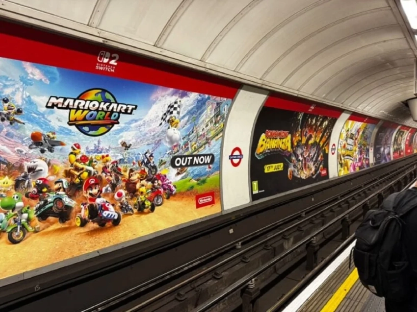 На другом плакате можно увидеть Mario Kart World с аналогичной пометкой «Уже доступно» (OUT NOW).