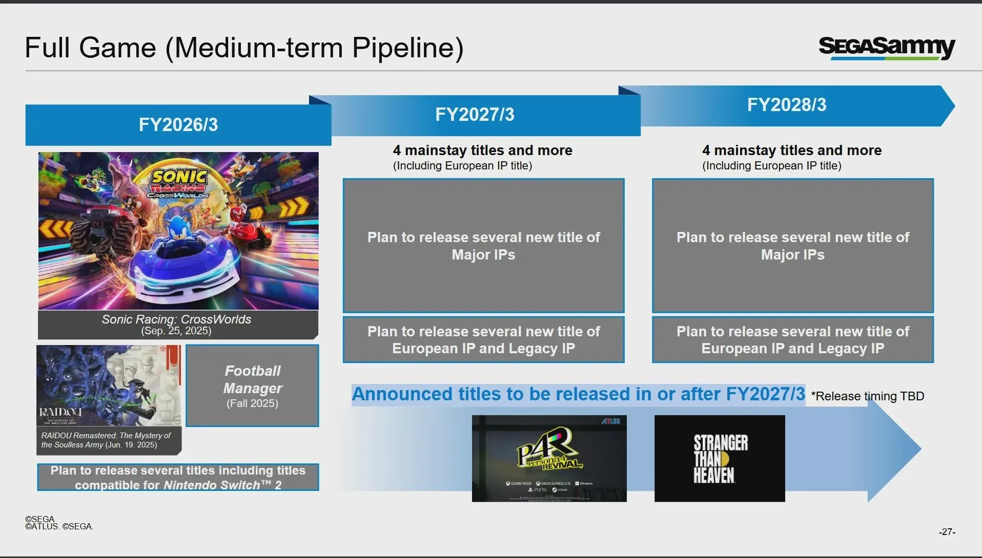 На 2027 и 2028 финансовые годы SEGA готовит по четыре крупных релиза ежегодно. Среди них ожидаются как продолжения популярных франшиз, так и проекты на основе других IP. Конкретные детали не раскрываются.