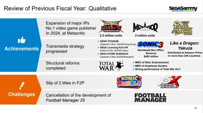Среди сложностей компания указала перенос двух условно-бесплатных проектов, включая Sonic Rumble и Persona 5: The Phantom X, а также отмену разработки Football Manager 25.