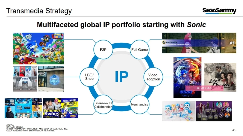 Компания также отметила успехи в своей трансмедийной стратегии: в Гонконге открылся тематический парк Sonic Stadium, в Токио прошел ивент SEGA Licensing Kick-Off, в Шанхае запустили новый фирменный магазин, а фильм «Соник 3 в кино» собрал 492 миллиона доллара по всему миру.