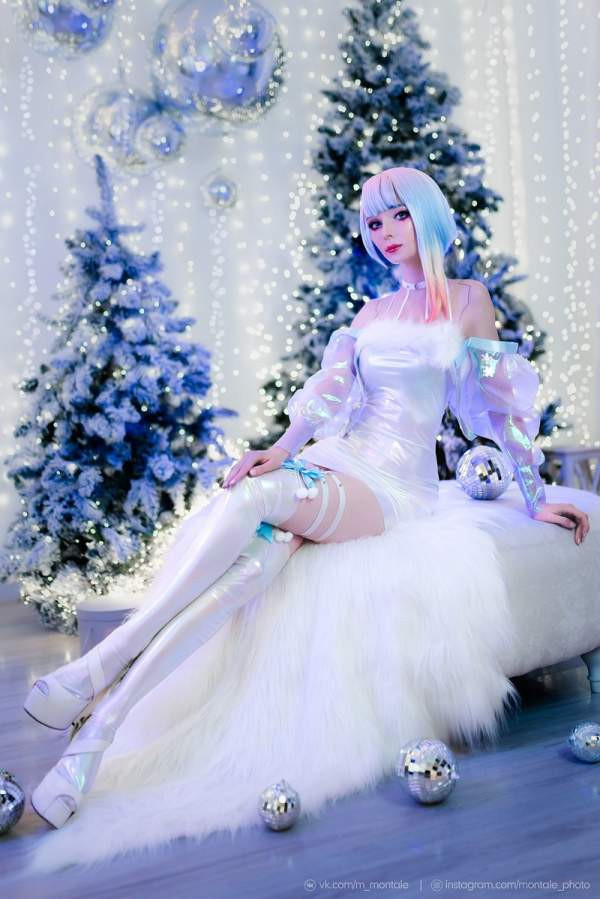 Люси стала любимицей интернета после Cyberpunk Edgerunners. Хоть Ребекка тоже приглянулась многим, но яркий образ Люси привлекает большее количество косплееров, а некоторые создают и вовсе совсем уникальные работы. Например, такой новогодний образ, который воплотила в жизни Марина Монталь.