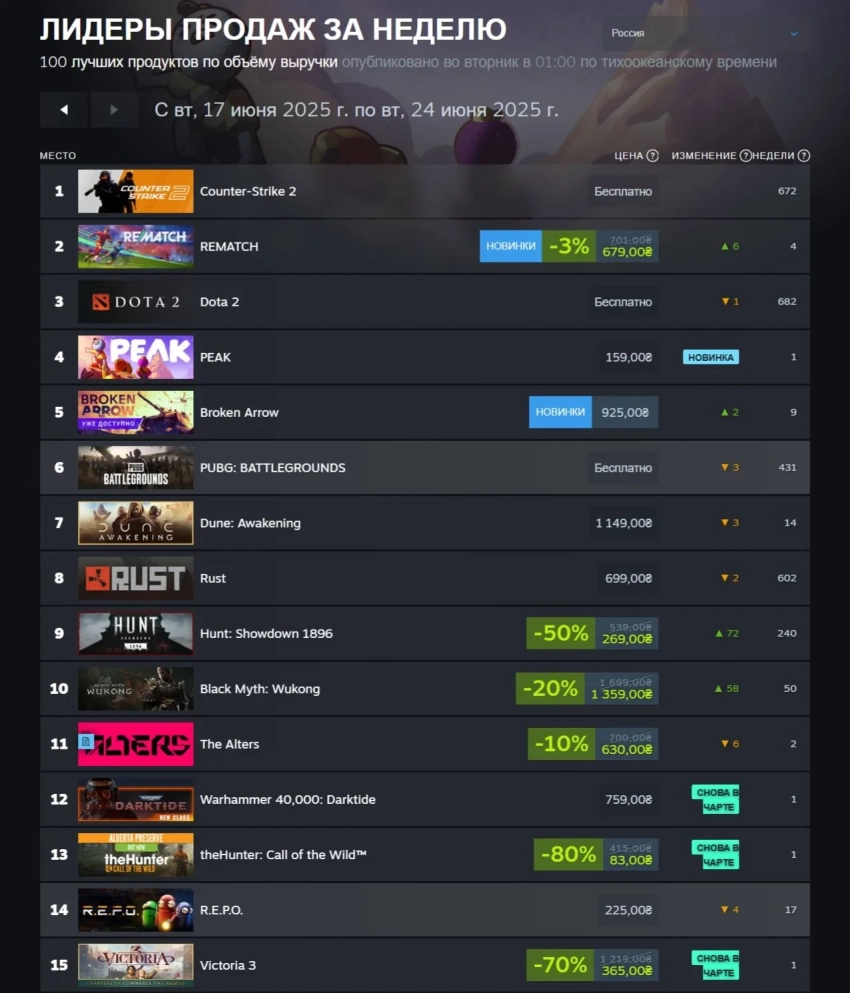 Российский чарт на этой неделе мало отличается от мирового: в нём присутствуют и Rematch, и Dune: Awakening, и Peak. И совсем немного не хватило стратегической выживалке The Alters до того, чтобы войти в десятку продаж.