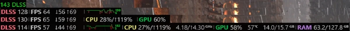 - значение FPS с отличием кадров, сгенерированных с помощью DLSS или FSR, от кадров игры;