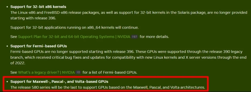 Например, обновления перестанут получать видеокарты GeForce GTX 700 и GTX 900. Также изменения коснутся тех видеокарт 10-й серии, которые работают на архитектуре Pascal. А ещё поддержки лишится лимитированный чип TITAN V, который работает на базе Volta.