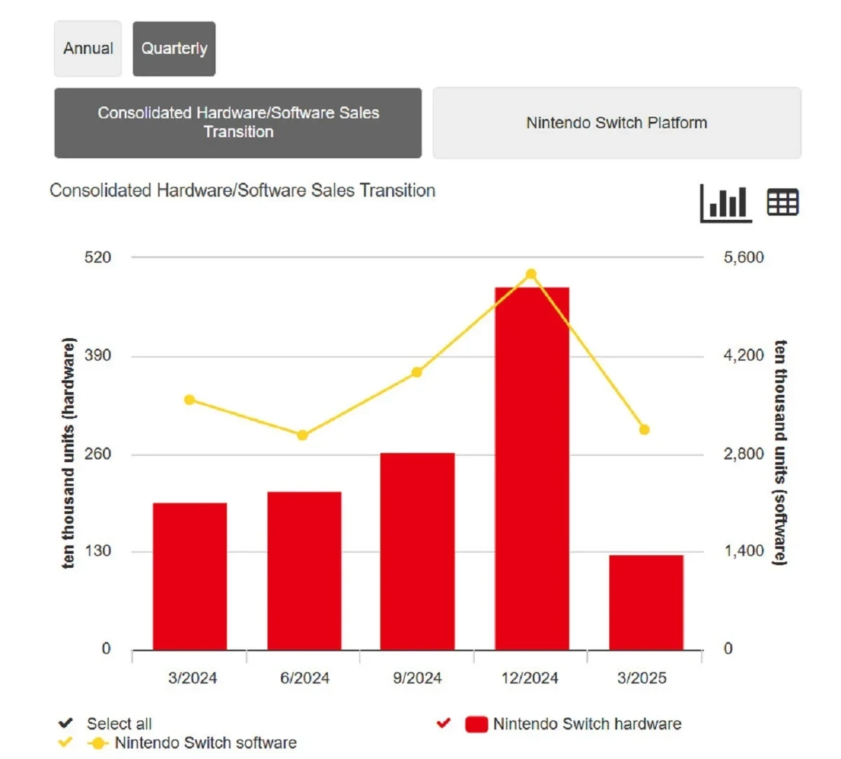 Подтверждение этой позиции можно увидеть, вновь зайдя на сайт с графиками продаж Nintendo. Оттуда была убрана вся информация о Switch 2 — остались лишь данные о прошлом поколении гибридной консоли.