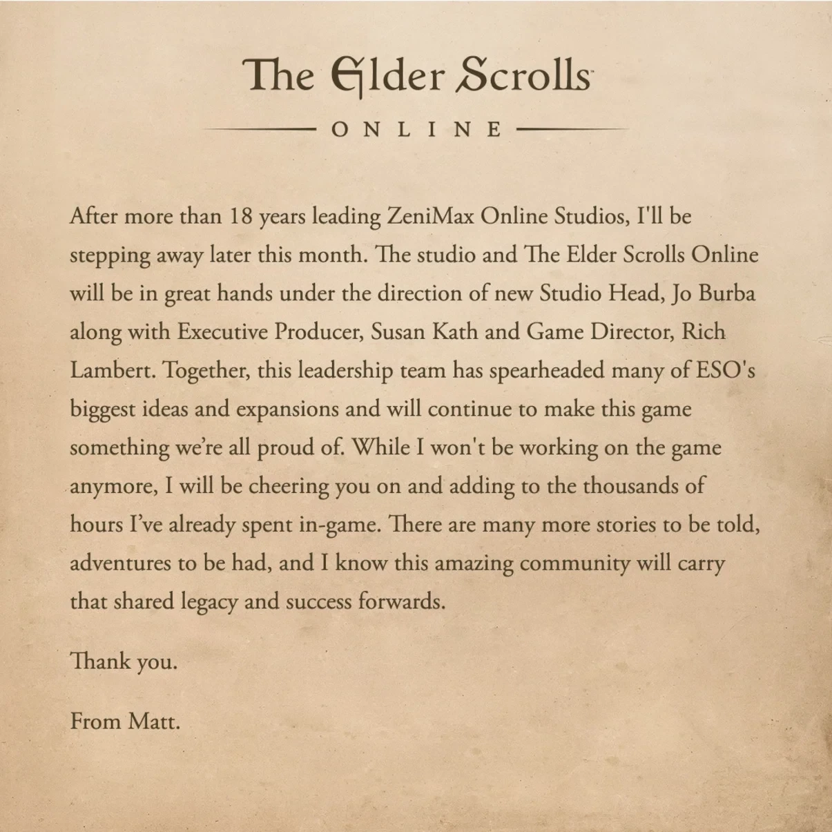 Параллельно стало известно об уходе президента ZeniMax Online Studios Мэтта Файрора — он покинет студию в конце месяца после 18 лет работы. Его место займёт Джо Бёрба.