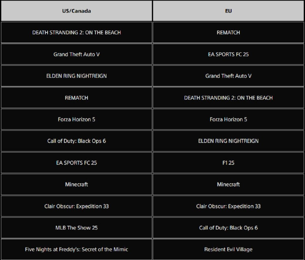 В США и Канаде же Rematch расположилась лишь на четвёртой строчке, уступив Elden Ring Nightreign и GTA 5. Зато по всех описываемых регионах пятое место занимает гоночная Forza Horizon 5. А Clair Obscur: Expedition 33, к счастью, заняла на 33-ю строчку, а девятую.