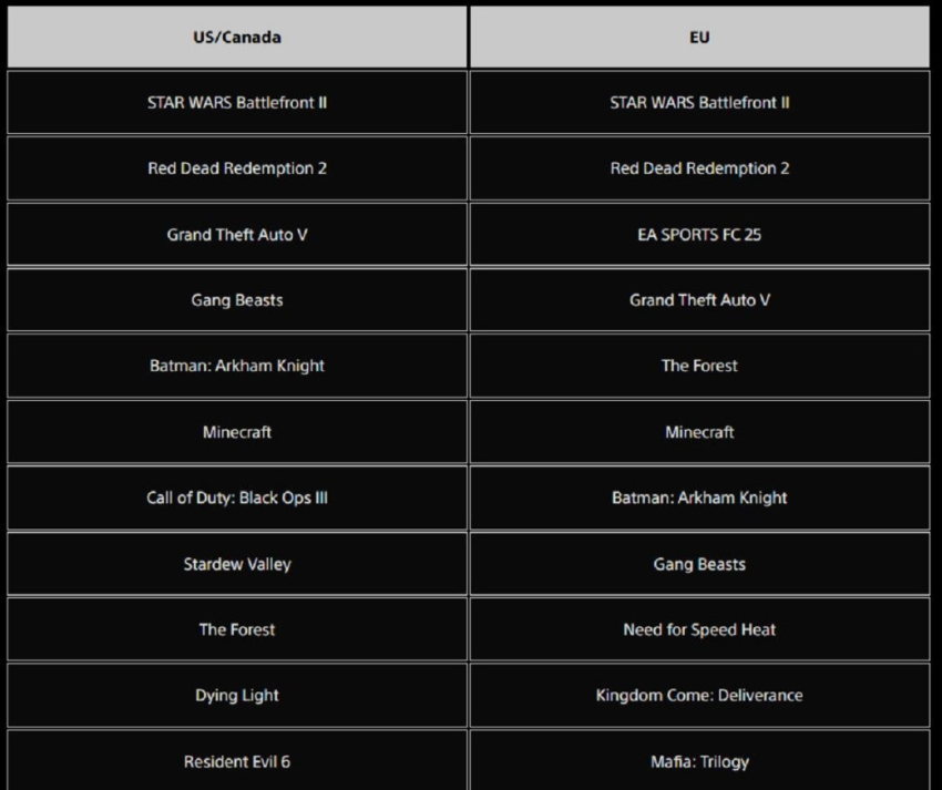 Новинок для прошлого поколения консолей выходит не так уж много, поэтому топ загрузок под завязку набит золотой классикой. Например, геймеры активно скачивали God of War (2018), а анонс девятой части наверняка привлёк внимание к Resident Evil 6 и Resident Evil 5.
