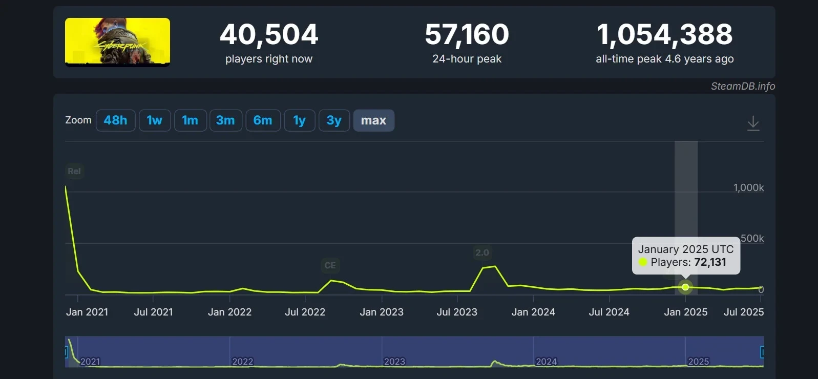6 июля, вскоре после анонса нового сезона «Бегущих по краю», пик суточного онлайна Cyberpunk 2077 превысил 66,5 тысячи единовременных игроков. В последний раз аналогичные показатели наблюдались 2 февраля этого же года. В целом же за последние годы всплеск активности в ролевой игре наблюдался в момент выхода сюжетного дополнения «Призрачная свобода» (осень 2023 года) и крупного обновления 2.2 (декабрь 2024 года).