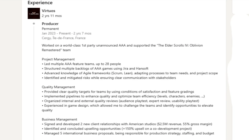 В сервисе LinkedIn некоторое время назад нашлась ещё одна подсказка. Как оказалось, нарративный дизайнер и ведущий сценарист Virtuos с апреля 2025 года работает над побочными квестами для дополнения к Cyberpunk 2077. Эта информация тоже вскоре была удалена из профиля.