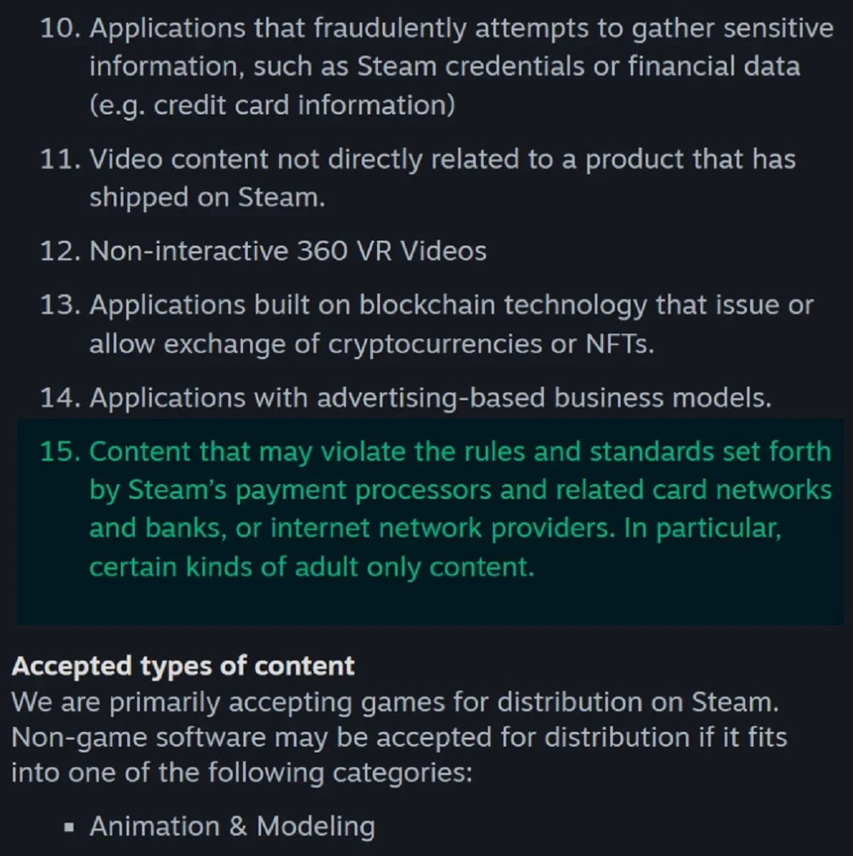 «Запрещён контент, который может нарушать правила и стандарты, установленные платежными системами Steam и связанными с ними сетями [банковских] карт и банками, а также интернет-провайдерами. В частности, некоторые виды контента только для взрослых», — новое ограничение Steam.