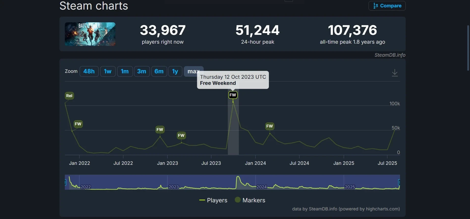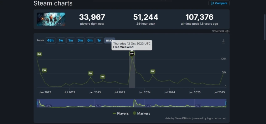 За последние 24 часа в Battlefield 2042 на пике в Steam находилось более 51 тысячи игроков (вечер 21 августа). В последний раз онлайн выше наблюдался лишь в октябре 2023 года — тогда в шутере провели бесплатные выходные, которые совпали со стартом шестого сезона. А в момент написания новости днём 22 августа в игре находится более 33 тысяч человек.