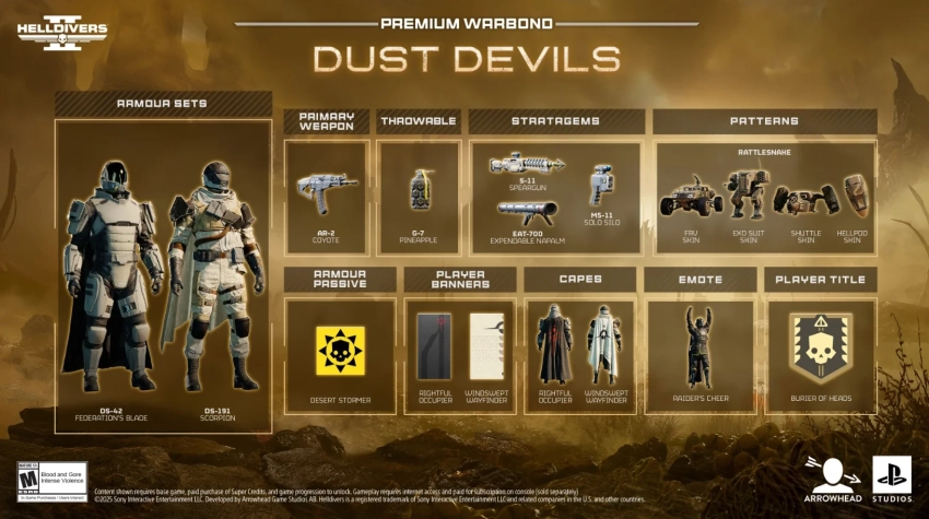Также внимания удостоилась премиальная заслуга Dust Devils — его тематикой стало выживание в экстремальных условиях. Она выйдет лишь 4 сентября. Комплект оказался стандартным для всех варбондов: новые виды оружия, брони и косметических предметов.