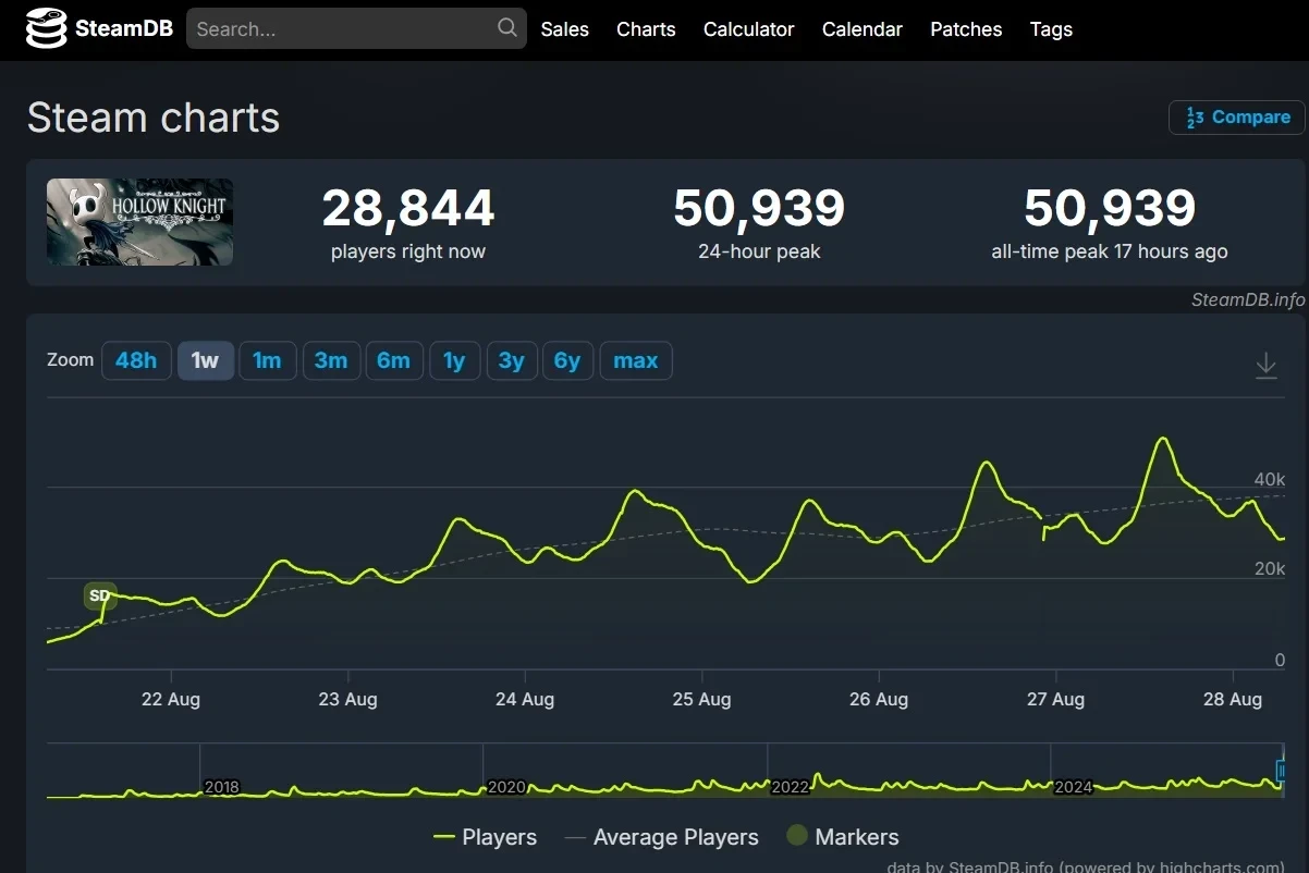 Онлайн Hollow Knight начал расти после анонса даты релиза Hollow Knight: Silksong. С 2022 года рекордным показателем был пик в 20 тыс игроков одновременно.