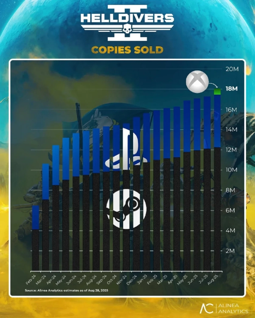 Самое интересное о кино на YouTube канале Игромании!Обложка: скриншот Helldivers 2Агентство Alinea Analytics поделилось своим исследованием о продажах Helldivers 2. По словам аналитиков, за три дня с момента релиза на Xbox Series (26 августа) тираж новенького порта превысил 600 тысяч копий — достойный результат и повторение ситуации, когда бывшие консольные эксклюзивы Xbox врывались в топ продаж на PlayStation 5.