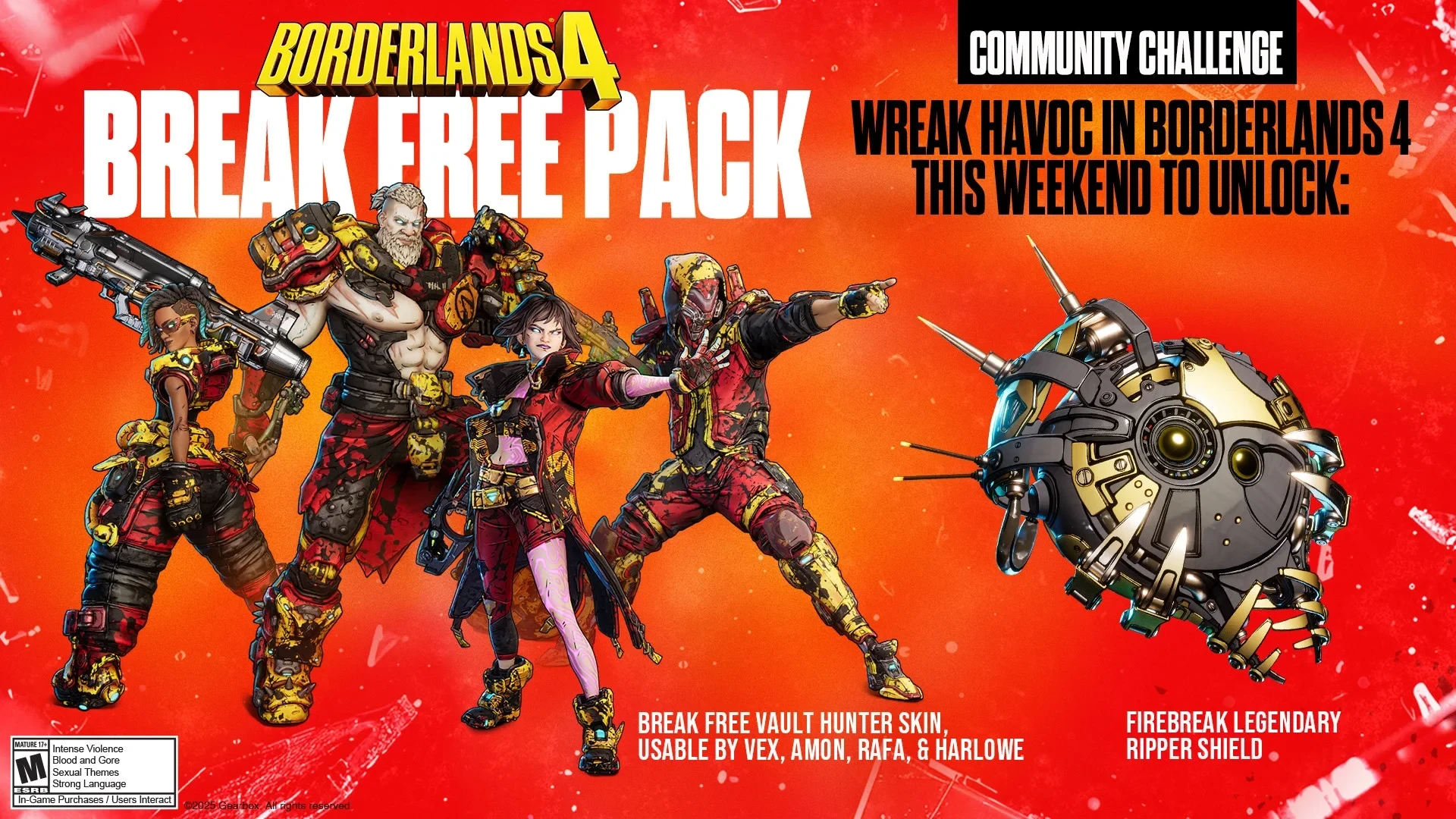 Дополнительной мотивацией зайти в Borderlands 4 для игроков станет бесплатный набор Break, состоящий из легендарного щита и скина для каждого Искателя Хранилища. Он будет поставляться в качестве кода активации, но лишь в том случае, если геймеры учинят «достаточно» беспредела на Кайросе в период с 12 по 14 сентября включительно. Разработчики будут отслеживать метрики.
