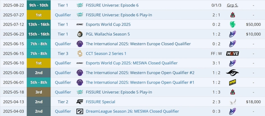 Весной 2025 года организация подписала костяк бывшей Chimera Esports с Никитой «Daxak» Кузьминым и Артёмом «lorenof» Мельником, а также усилилась Владиславом «Rein» Косыгиным. Летом ростер выступил неудачно: среди прочего команда провалила Esports World Cup 2025 и брала первые места лишь на отдельных квалификациях.