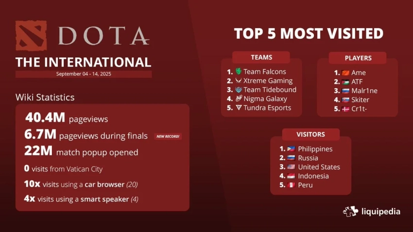 Самое интересное о кино на YouTube канале Игромании!Обложка: ValveНа Liquipedia подвели итоги просмотров The International 2025 по Dota 2. Россия заняла второе место по количеству посетителей сайта, обогнав США, Индонезию и уступив лишь Филиппинам.